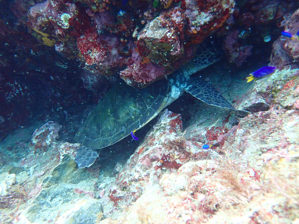 段落ちのオーバーハングでは秋の浜でよく見られるアオウミガメの子供が休んでいます。